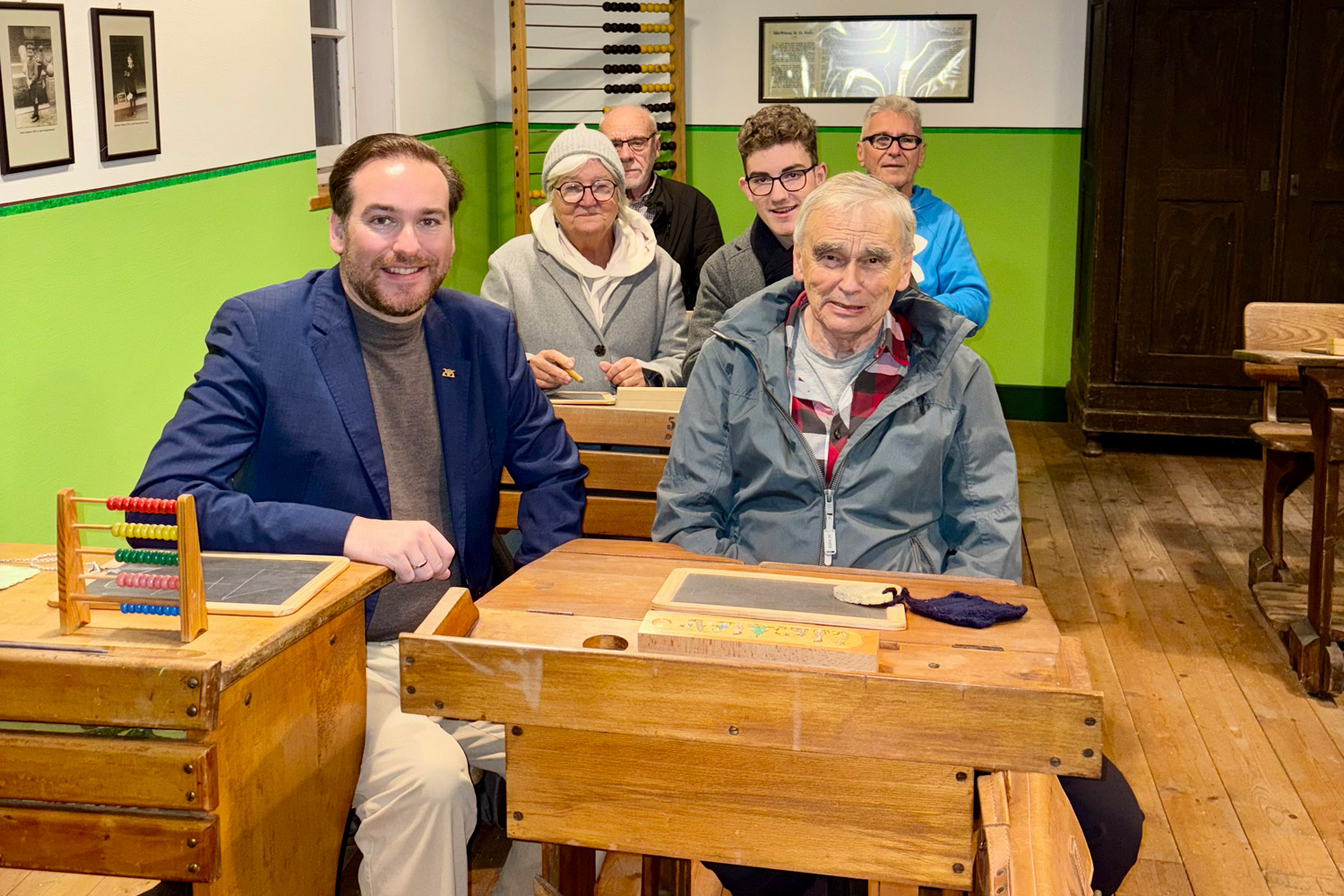 Das 19. und 20. Jahrhundert waren von massiven Epochenumbrüchen wie der industriellen Revolution und den zwei Weltkriegen geprägt. Diese Umwälzungen haben auch in Oftersheim bleibende Spuren hinterlassen. Auch hiervon zeugt das Gemeindemuseum, beispielsweise durch die „Katscher Stube", in der die Rolle der Heimatvertriebenen thematisiert wird. In einer Schulstube aus der Zeit Anfang des 20. Jahrhunderts bot sich Andreas Sturm dann noch die Gelegenheit für eine besondere Begegnung: Gemeinsam mit seinem ehemaligen Gemeinschaftskundelehrer Michael Fricke, der überraschend zum Museumsbesuch gekommen war, konnte Sturm erneut auf der Schulbank sitzen - ein für Sturm und Fricke herzliches Wiedersehen.